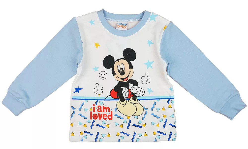 A kék színű, vékony pamutból készült felső és a gumis derekú nadrág kényelmes viseletet biztosít, miközben a kedvenc Disney karaktere, Mickey egér mosolyog vissza róla.