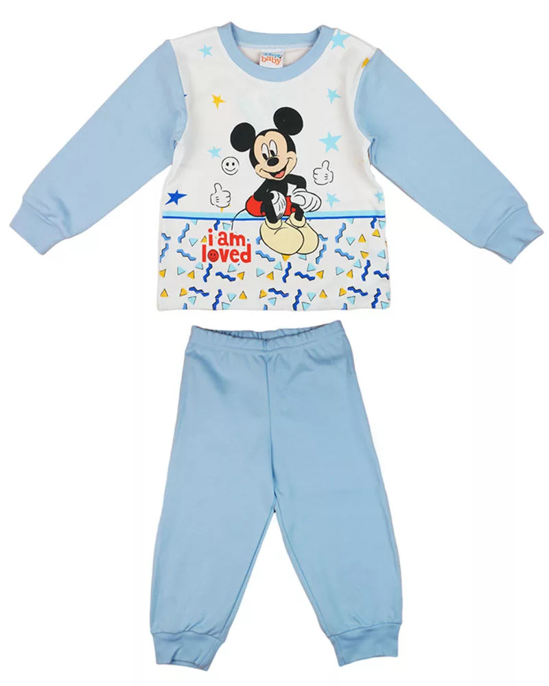 A kék színű, vékony pamutból készült felső és a gumis derekú nadrág kényelmes viseletet biztosít, miközben a kedvenc Disney karaktere, Mickey egér mosolyog vissza róla.