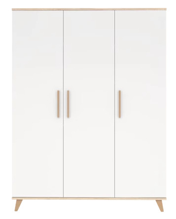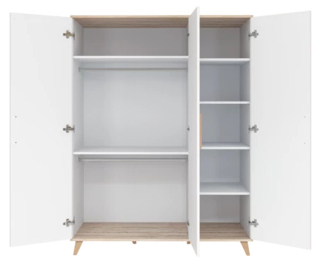 A FLIP White & Oak háromosztású szekrény tökéletes megoldás azok számára, akik hosszú távra terveznek, és szeretnének bőséges tárolóhelyet biztosítani gyermekük holmijainak. A szekrény nagyobbik két részében két fix polc és két akasztórúd segíti a ruhák praktikus rendszerezését, míg a harmadik osztás teljes egészében polcozott, ahol négy darab tágas polc kínál helyet a kiegészítők, játékok vagy összehajtott ruhák számára.