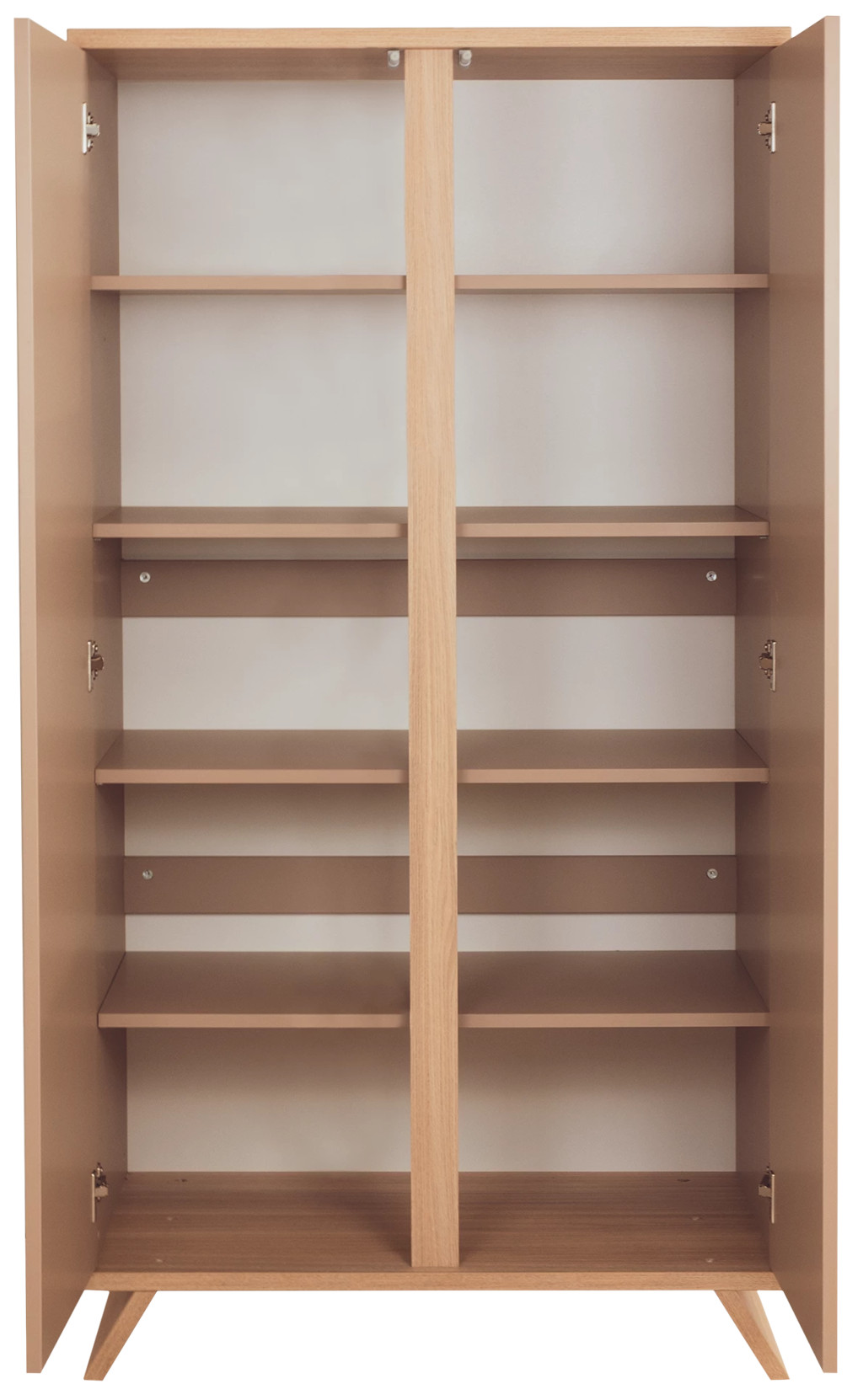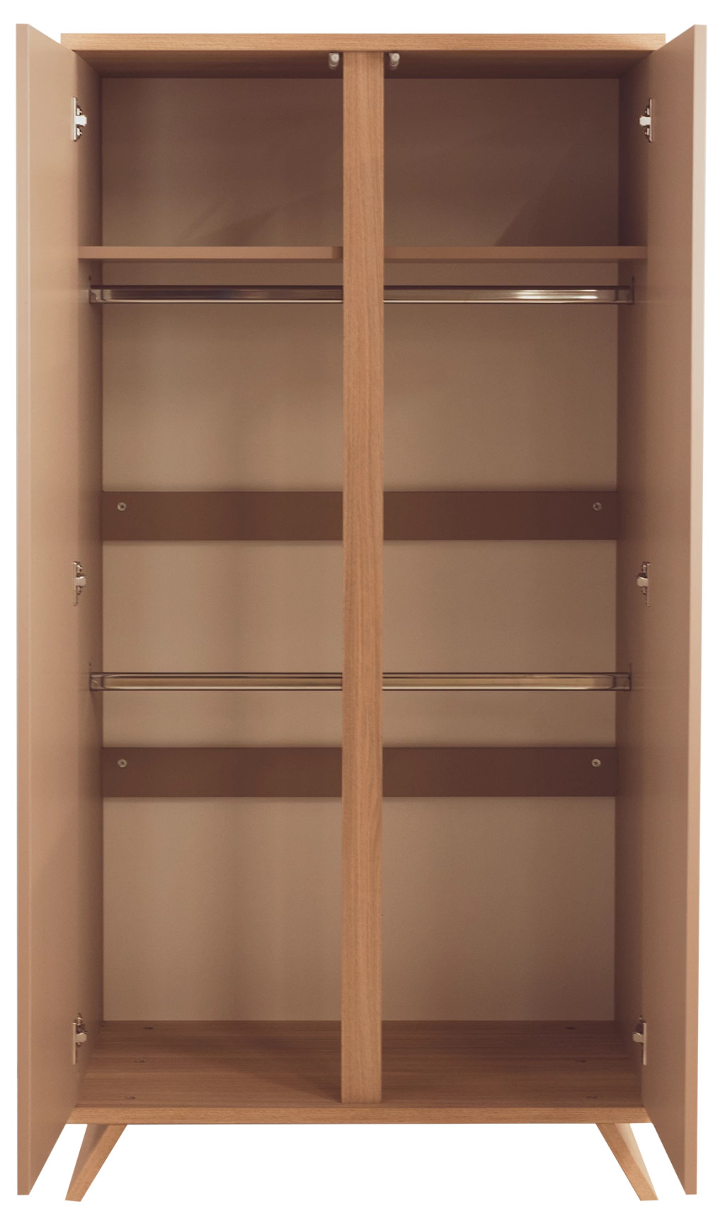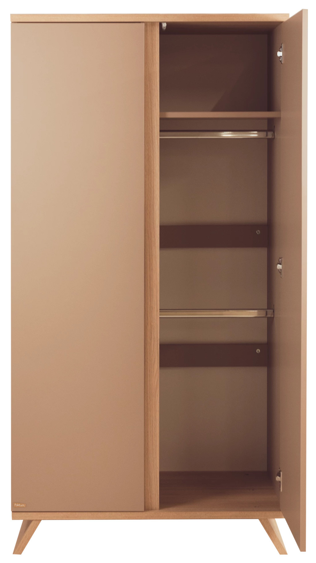 A Sienna Cappuccino 2 osztású szekrény a babaszoba nélkülözhetetlen tárolóbútoraként minden igényt kielégít. Praktikus belső akasztós kialakításának köszönhetően átláthatóan és könnyen kezelhetően tudod tárolni kisbabád ruháit. Továbbá a szekrényen belüli felső polc kialakítás a szekrény méreteinek kihasználását maximalizálja. Igény szerint további 3 db polccal is kiegészíthető.