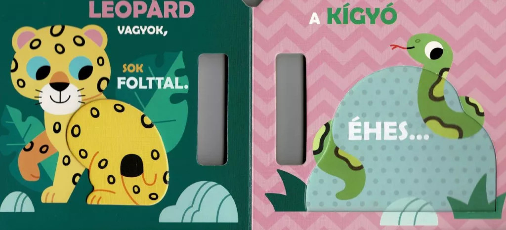A kötetben többféle vadon élő állat bukkan fel, így a gyerekek már egészen kicsi korban találkozhatnak olyan különleges szereplőkkel, mint a leopárd, a kígyó, az elefánt, a majmok, a színpompás papagáj, a krokodil, a tukán és a párduc. Minden oldalpár egy-egy állatot vagy jelenetet mutat be, a képek pedig egyszerűen értelmezhetők, így a kicsik könnyen felismerik, mit látnak: foltos bundát, hatalmas ormányt, hosszú farkat vagy éppen egy nagy csőrt. A könyvben szereplő állatok változatossága miatt a lapozó sokáig érdekes marad, hiszen mindig akad valami, amit újra meg lehet nézni, meg lehet nevezni, vagy rá lehet mutatni.