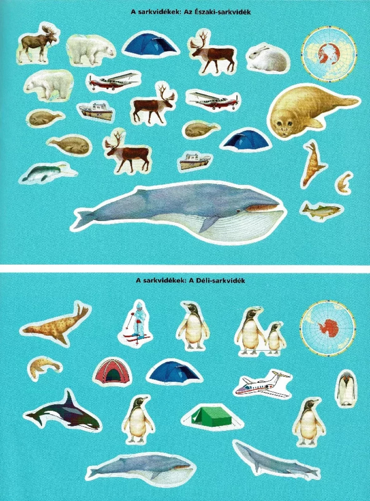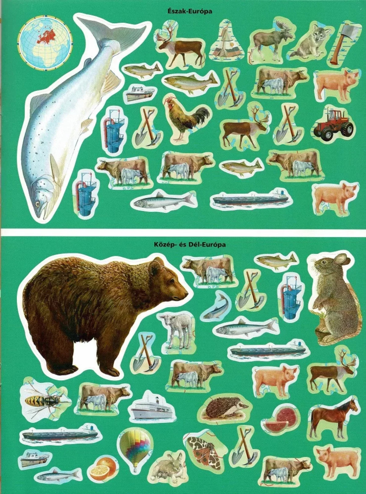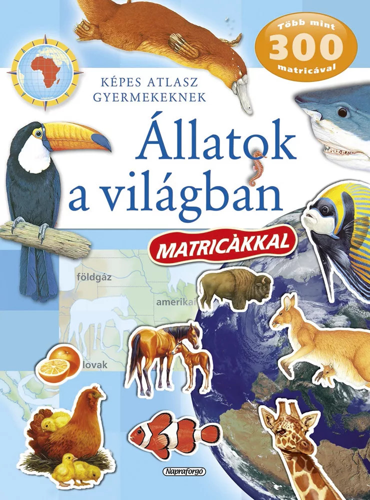 A Képes atlasz gyermekeknek című sorozatunkban két matricásfüzet is található. Az állatok a világban matricákkal című füzet nagyon tartalmas, olvasható benne rövid ismertető a földrészekről, azok jellegzetes állat- és növényvilágáról, és természetesen magukról az állatokról.
