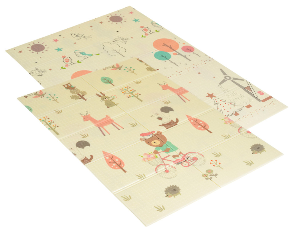 A játszószőnyeg mindkét oldalon vidám motívumokkal ellátott nyomtatással, csúszásmentes felületkezeléssel, nagyszerű szigeteléssel és hangszigeteléssel rendelkezik, vízálló, puha felületű, rugalmas, mégis méretstabil, összehajtható, és mindenekelőtt biztonságot nyújt a gyermekeknek játék közben.
