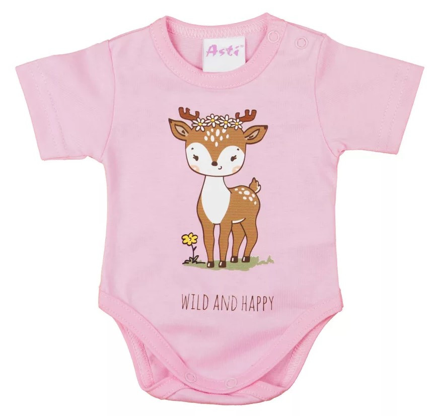 Varázsoljon egy mosolyt a picurka arcára ezzel a rózsaszín, rövid ujjú bodyval, melyet egy cuki Őzike minta díszít.