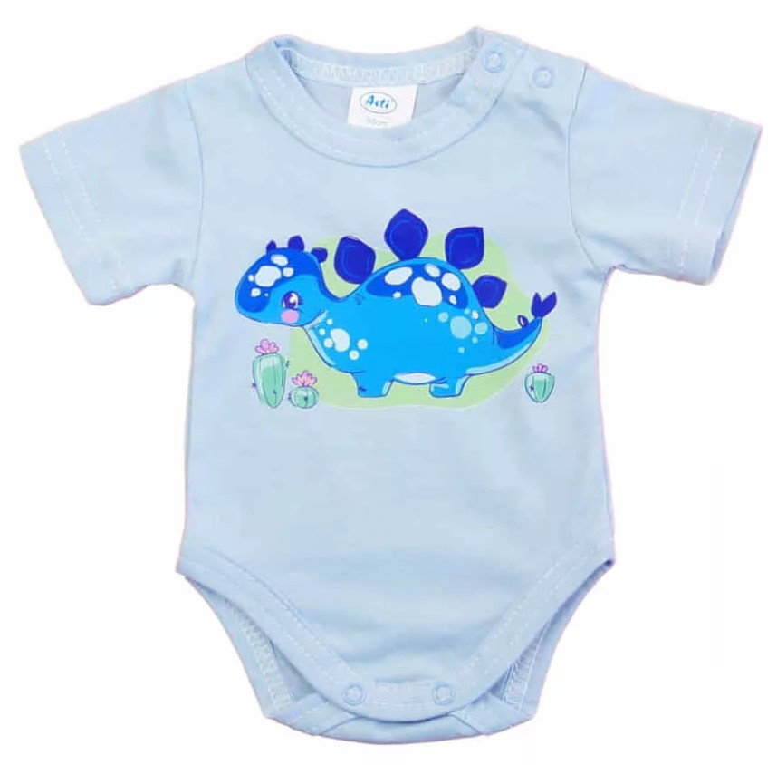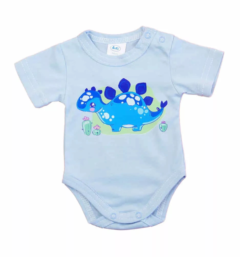 A vidám színű, rövid ujjú baba body vagány mintával varázsolja még édesebbé kisbabáját.