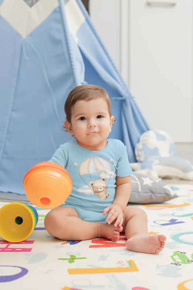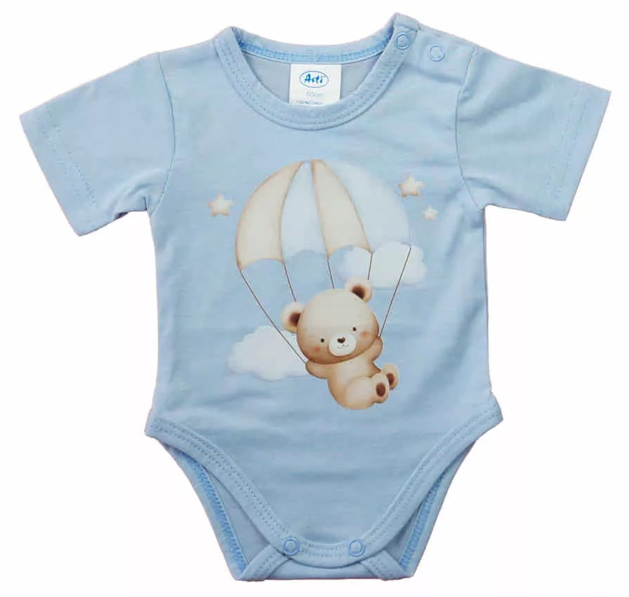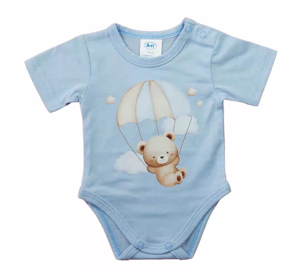 A vidám színű, rövid ujjú baba body bájos mintával varázsolja még édesebbé kisbabáját.