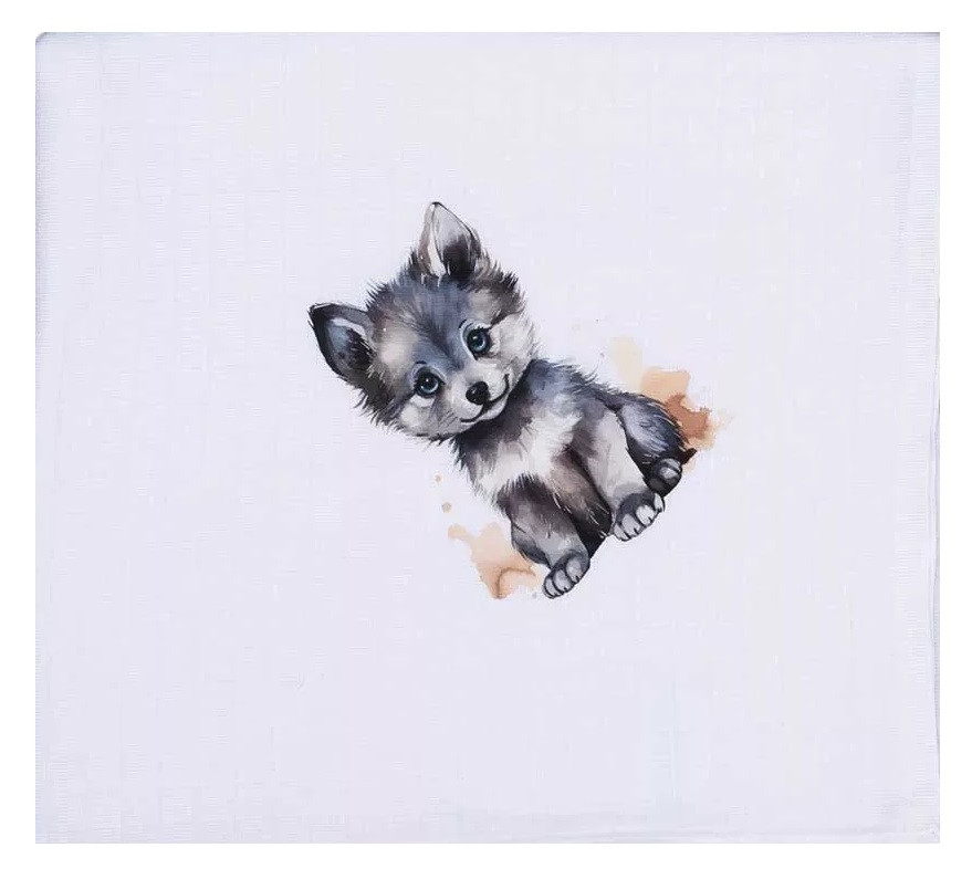 A gyönyörű farkas mintával díszített, 70x70cm-es textil tetra pelenkánk puha, kényelmes, és tökéletesen megfelel mindennapi használatra.