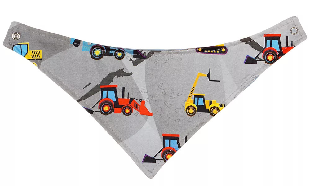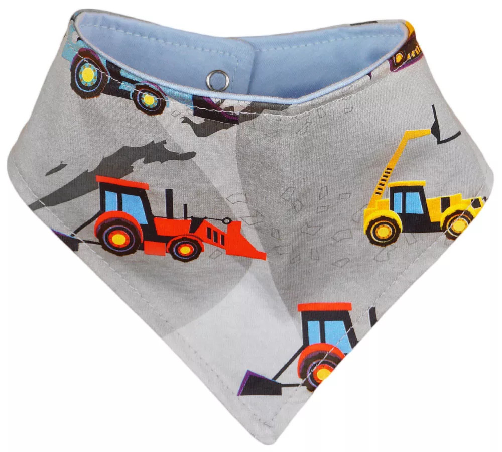A szürke alapszínű, traktoros mintával díszített nyálkendő igazi játékosságot visz a mindennapokba.