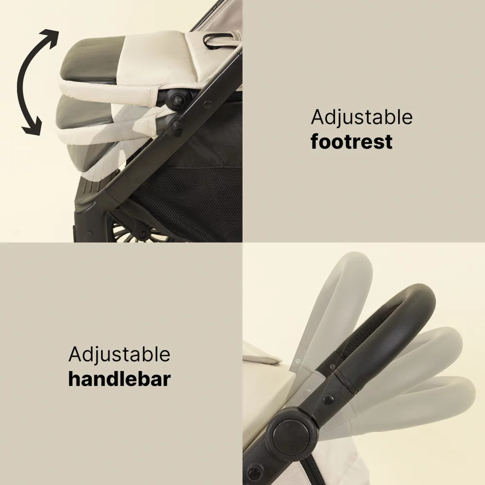 A Moya babakocsit úgy tervezték, hogy bírja a mindennapi használatot – legyen szó városi utcákról vagy parkokról. A masszív vázszerkezet stabilitást biztosít, míg a gumírozott, rugózott kerekek hatékonyan csillapítják az egyenetlenségeket. A tágas ülőrész és a fekvőpozícióig dönthető háttámla maximális kényelmet kínálnak minden helyzetben.