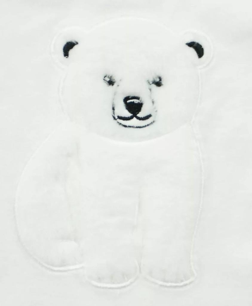 A hosszú ujjú fazon kényelmes viseletet biztosít, két ujja és a kis cipőcskék telenyomott mintával készültek, míg az elején egy aranyos, szőrös jegesmedve hímzés díszeleg.