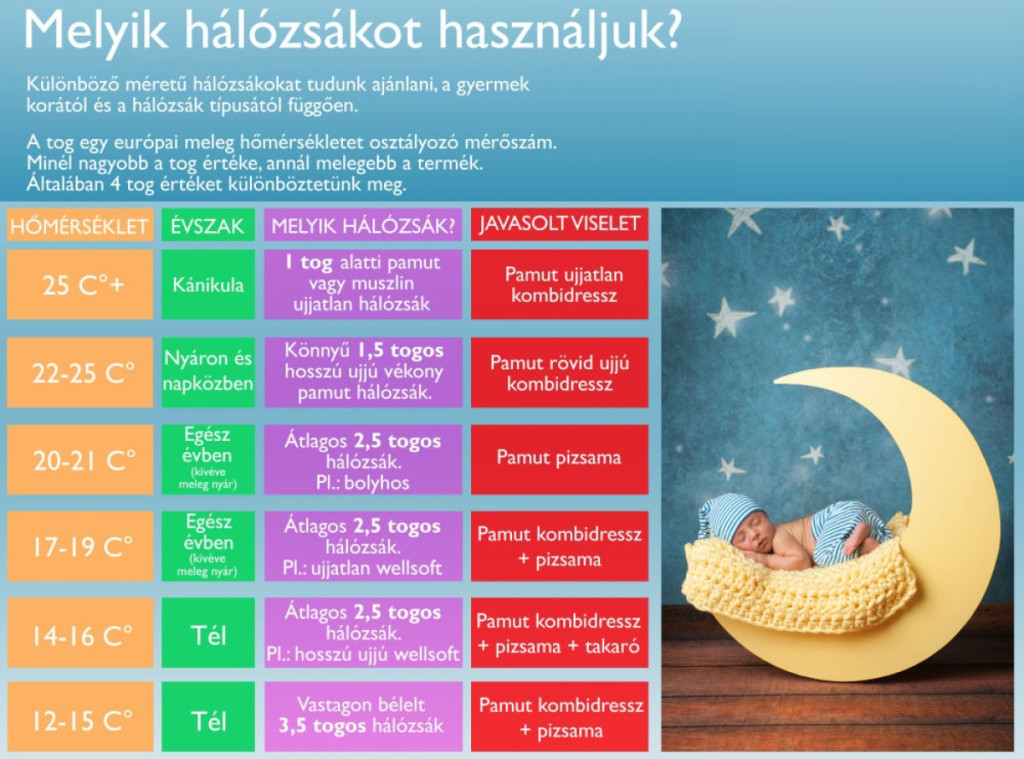 A mellékelt táblázat segítségével könnyen kiválaszthatod a megfelelő hálózsákot a szoba hőmérséklete szerint.