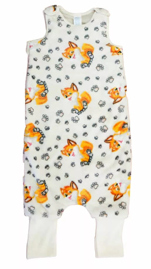 Kisróka mintával nyomott oldalt cipzáras, vállon patentos, lábfejnél ráhúzható, ujjatlan pamut tipegő hálózsák.