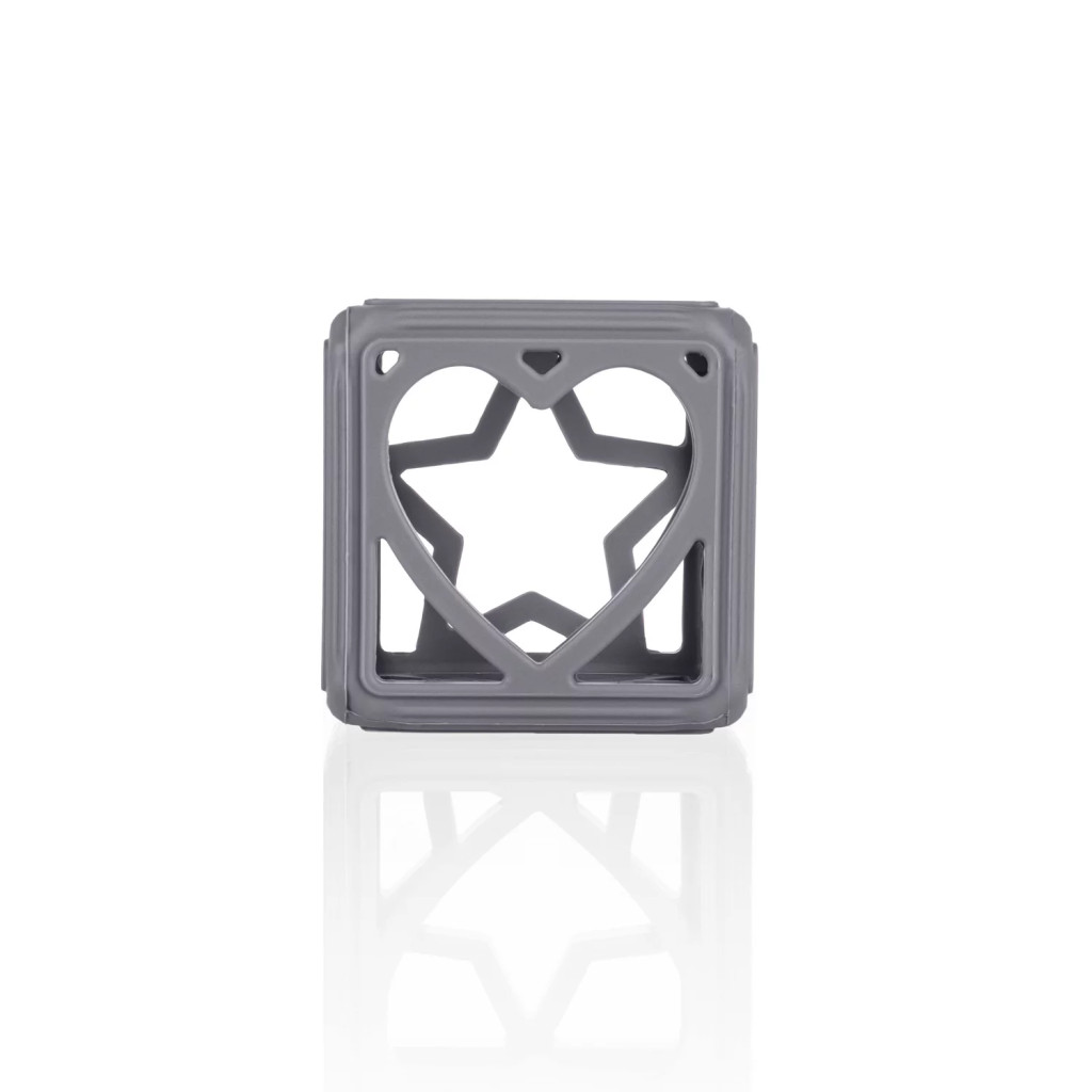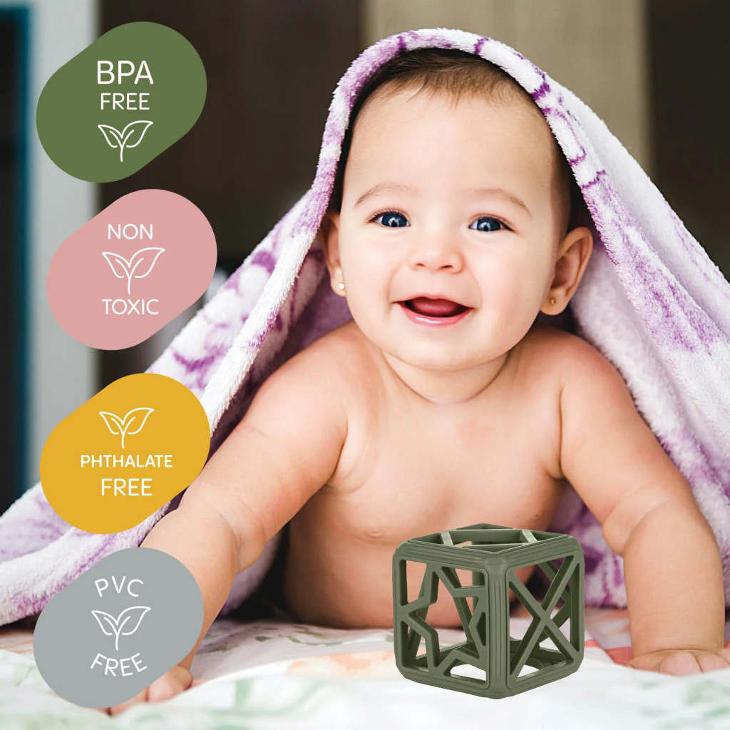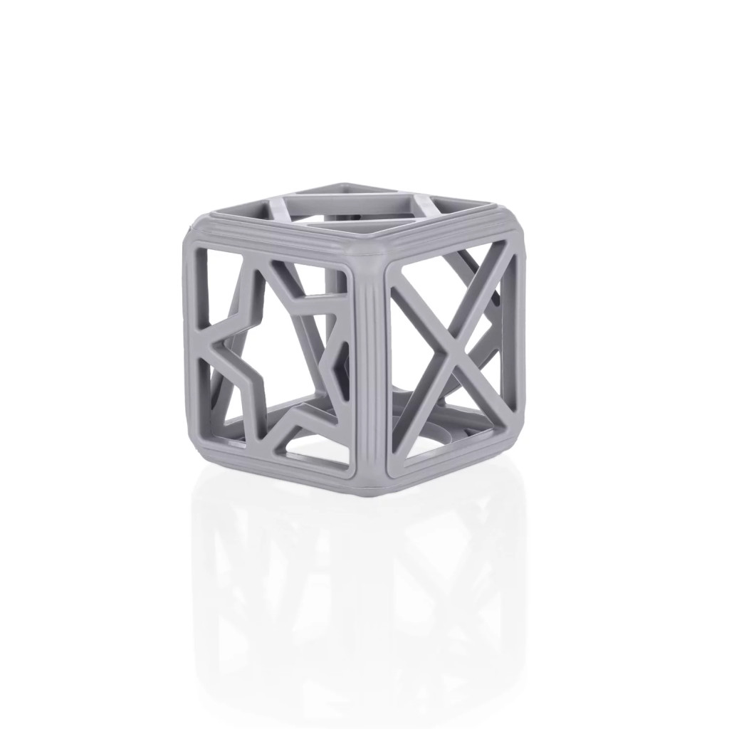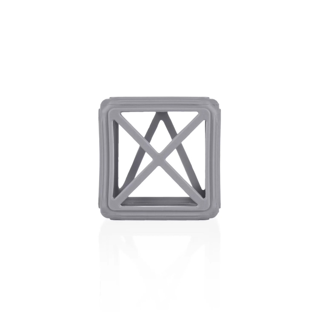 A kocka alakú szilikon rágóka megadja a szükséges megkönnyebbülést, miközben támogatja a finommotorika fejlődését.