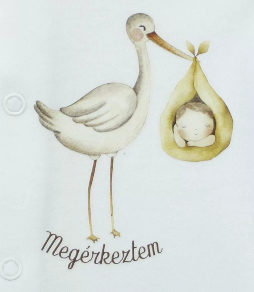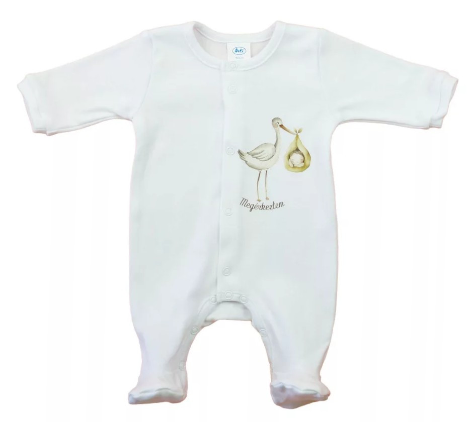 A kényelem és a stílus tökéletes kombinációját kínálja ez a rugdalózó, amelyet gólya mintával díszítettünk. vékony pamut, bababarát anyagból készült, kényelmes viseletet biztosítva egész napra.