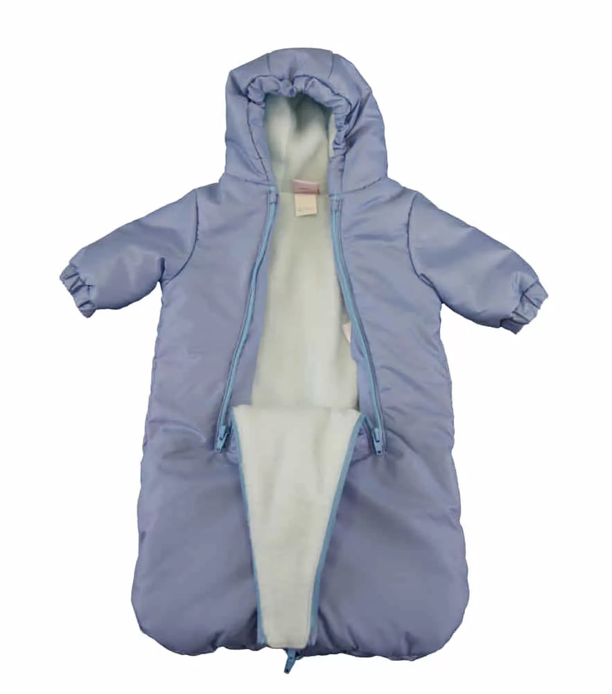 Elől praktikus czipzárral ellátottt babazsák vízlepergető anyagból készült, meleg polár béléssel, kapucnival, a baba fejének melegen tartásához.
