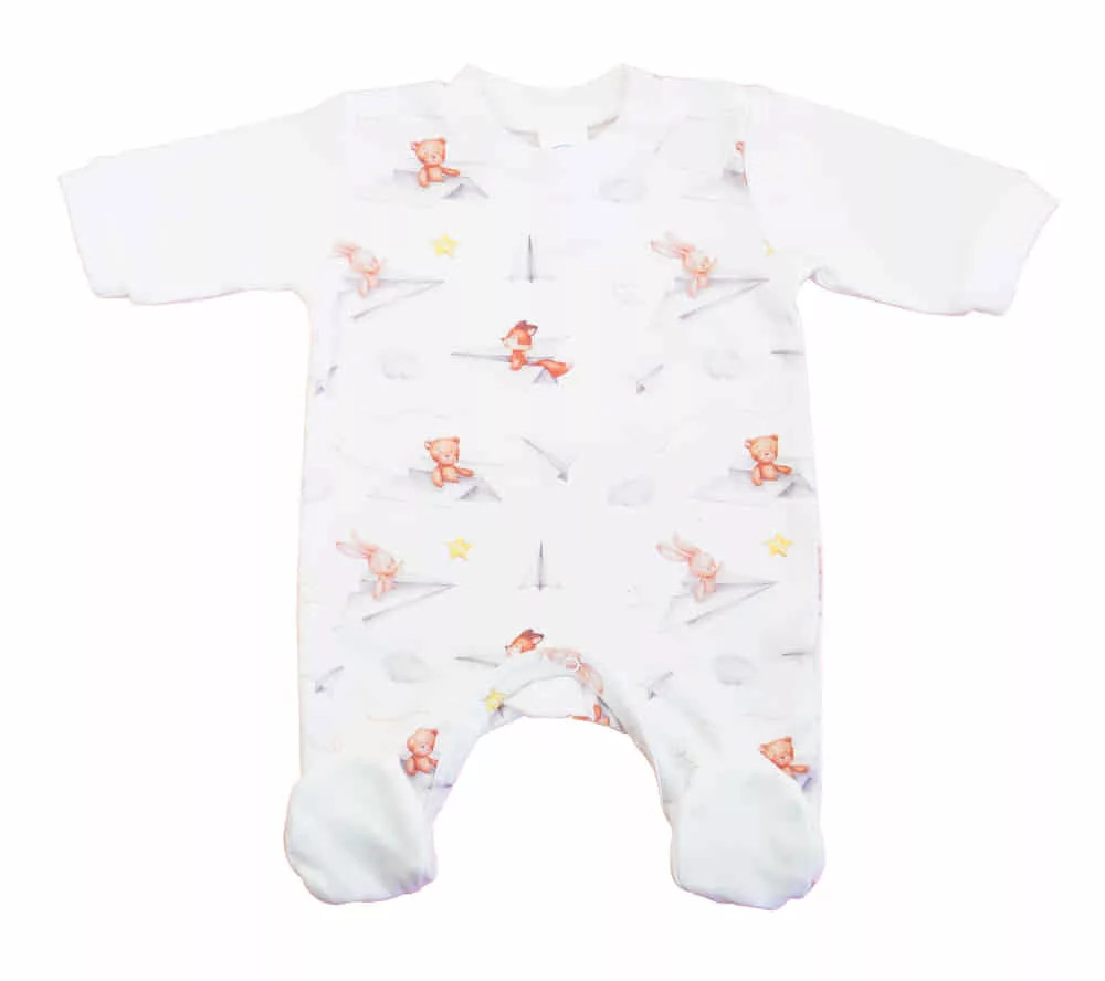 Praktikus és kényelmes viselet ez a nagyon cuki macis mintával telenyomott baba rugdalózó.