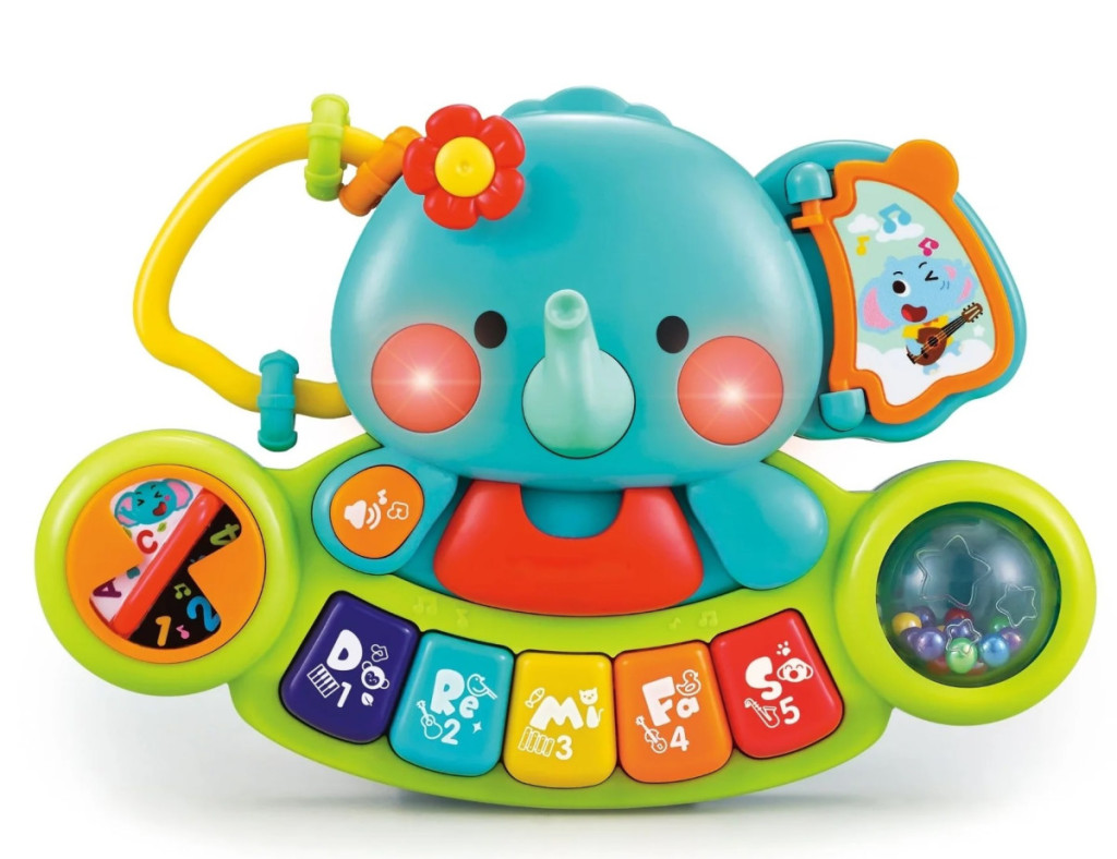 A játék rendelkezik: zongora billentyűkkel, hangerőszabályzó gombbal, villogó fényekkel, szórakoztató hangeffektekkel, forgó törzzsel.
