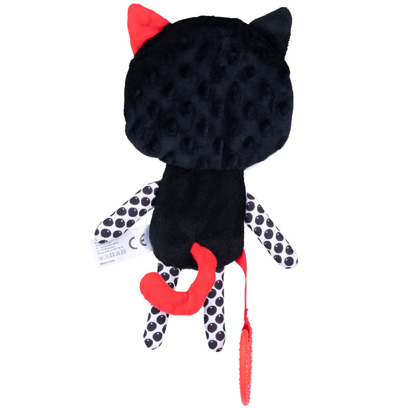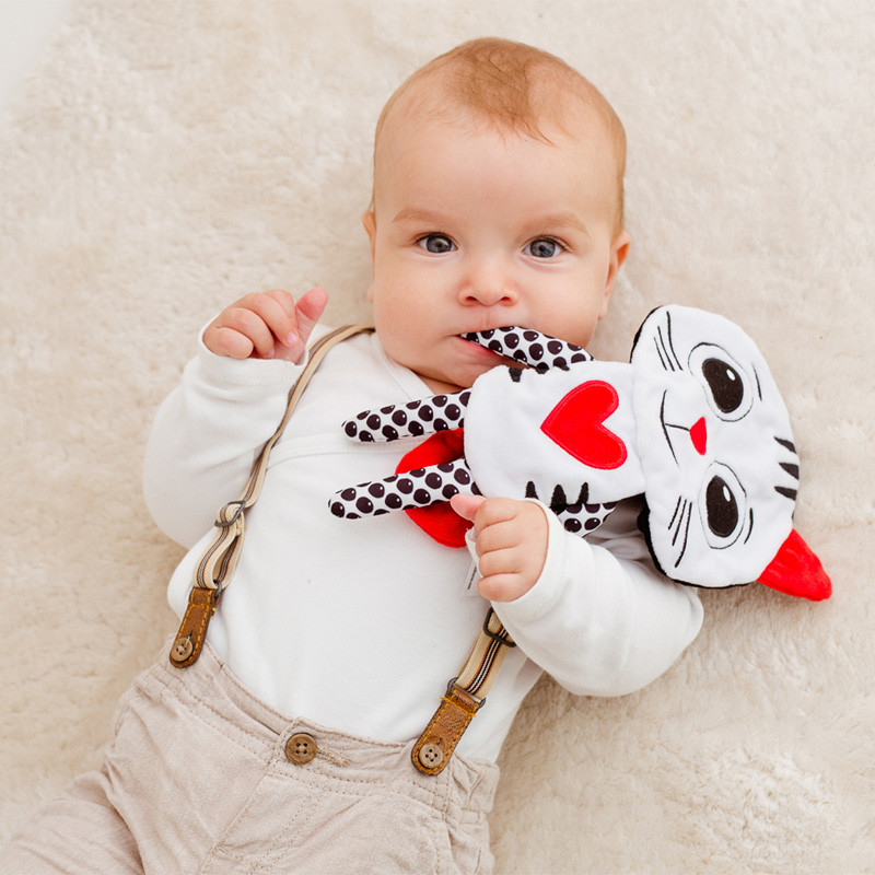Az imádnivaló cica kontrasztos színei, és a különböző textúrák serkentik a babák látását, tapintását és hallását.