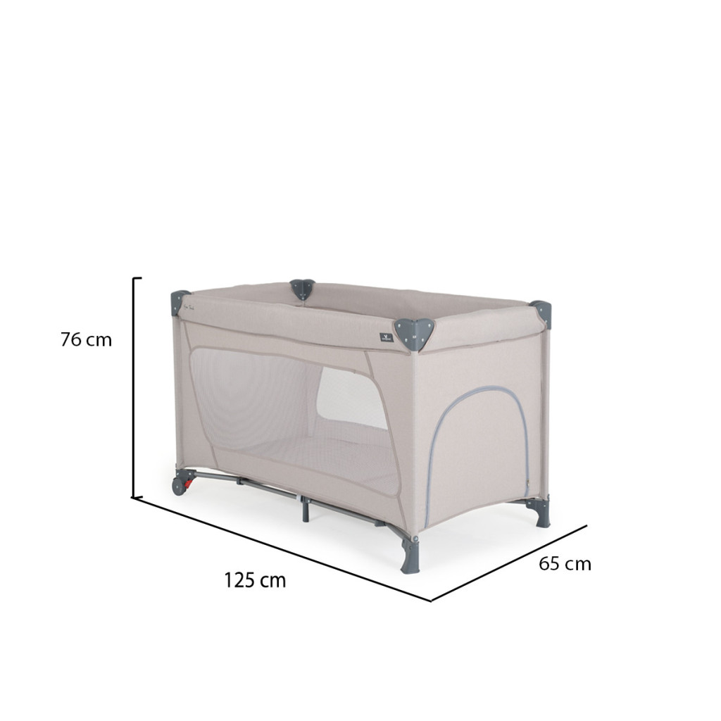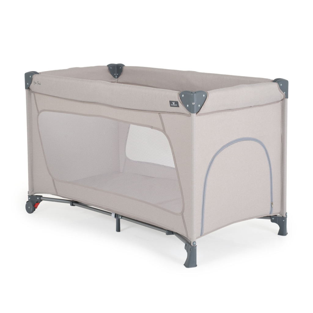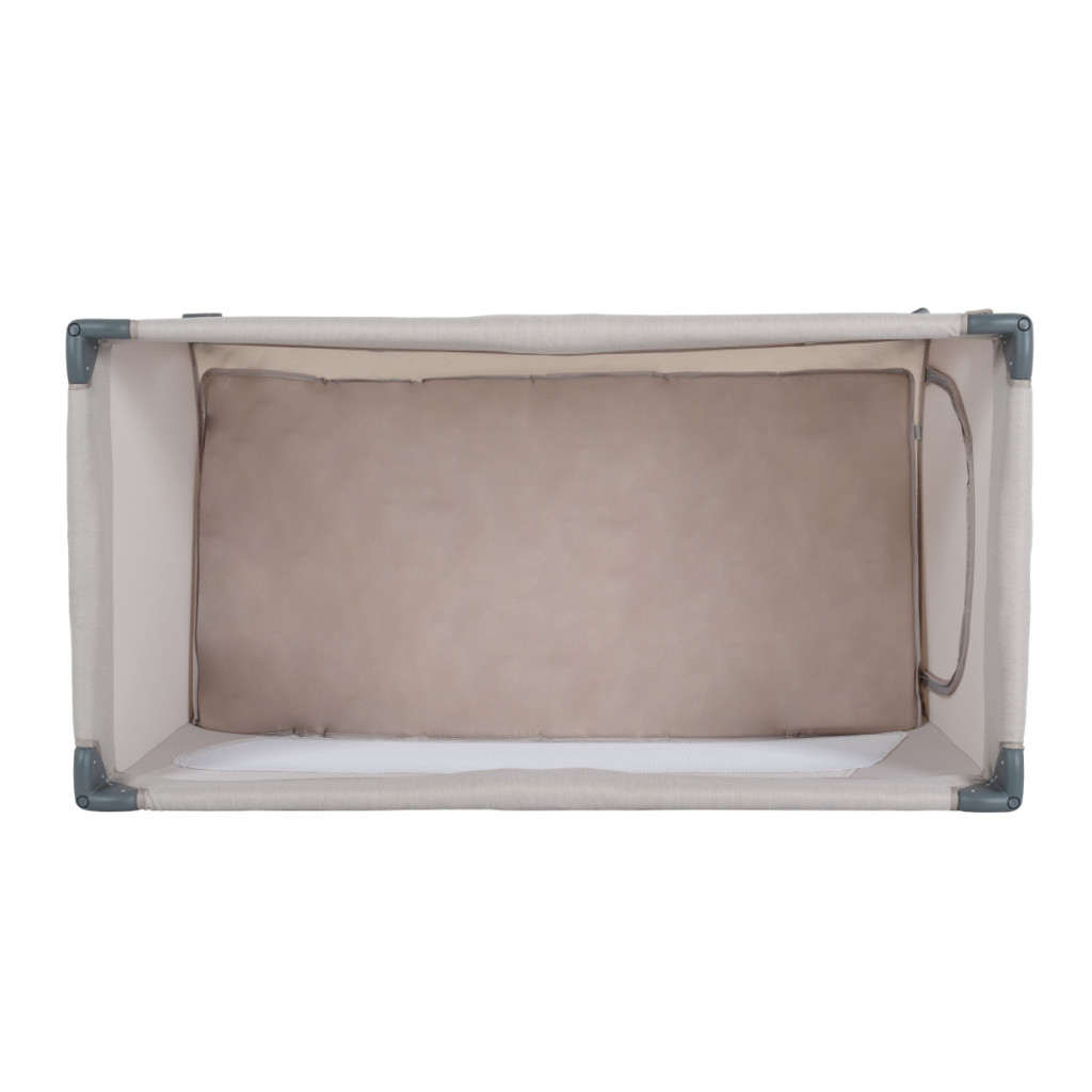 A utazóágy 2 fékezhető kerékkel, cipzáras oldalsó bejárattal, 1,5 cm vastag matraccal és hordozótáskával rendelkezik, így bárhová könnyen magaddal viheted.