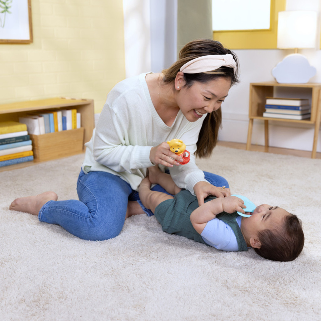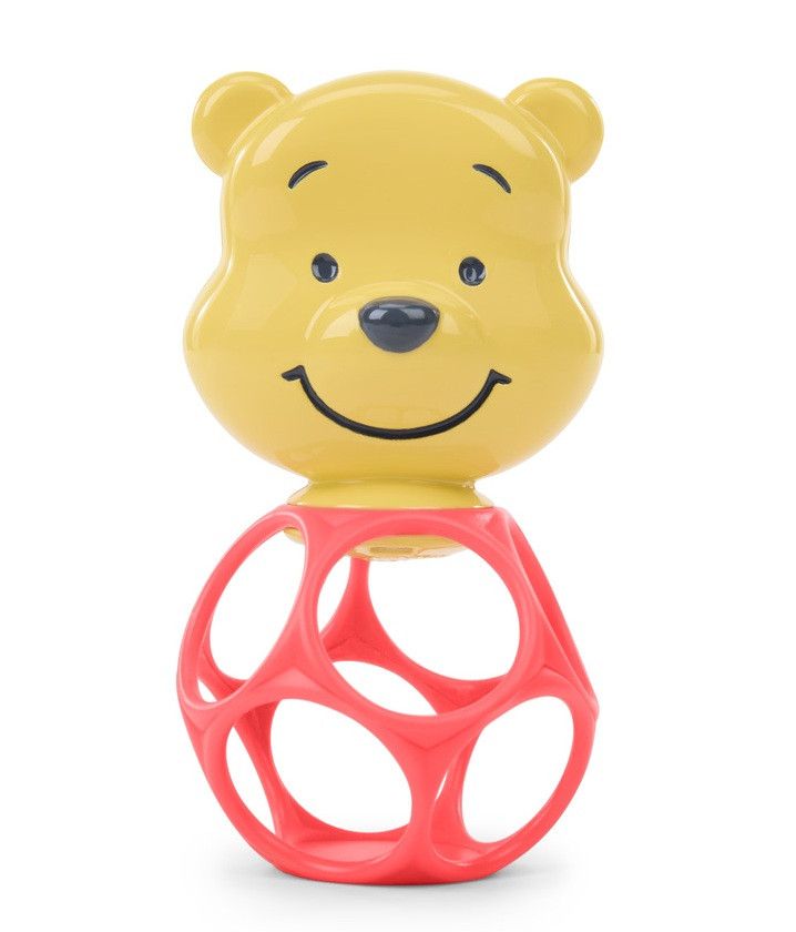 A 2 az 1-ben készlet tartalmaz egy rugalmas, könnyen megfogható Oball csörgőt a szeretett Micimackó motívummal és egy mézes bödön formájú rágókát, amely enyhíti az íny fájdalmát az első fogak kibújásakor.