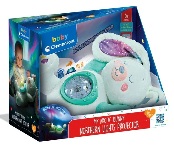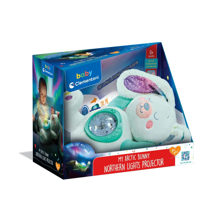 Ez a varázslatos plüss nyuszi nemcsak egy pihe-puha ölelgetnivaló társ, hanem egy igazi kis éjszakai segítő is, aki megnyugtatja és álomba ringatja a babádat. A Clementoni „My Arctic Bunny” plüss nyuszi Északi fény projektorral egy különleges, fejlesztő bébijáték, ami tökéletes már újszülött kortól. A nyuszi pocakjában található projektor színes, mozgó fényeket vetít a mennyezetre, amik az északi fényt idézik – ez segíti a megnyugvást és eltereli a babák figyelmét a fáradtságról, így könnyebben jöhet az elalvás.