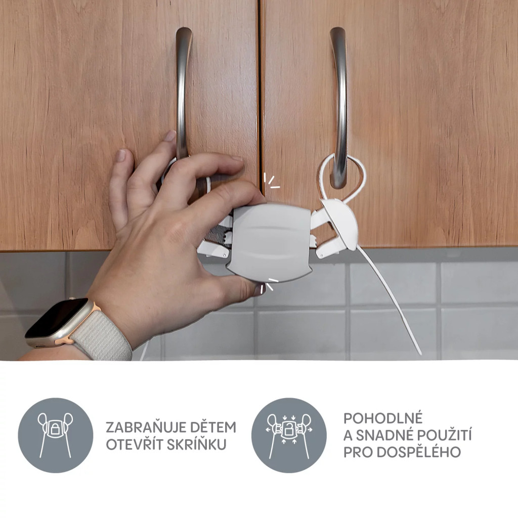 A szekrények tartalma biztonságban maradA kisgyermekek rendkívül kíváncsiak és szeretnek új dolgokat felfedezni, ami magában foglalhatja a szekrények és fiókok nyitogatását is. Az univerzális zár ezért úgy lett tervezve, hogy megakadályozza a gyermekeket abban, hogy hozzáférjenek a szekrényekben lévő veszélyes tárgyakhoz, ezzel nyugalmat és biztonságot nyújtva a szülőknek.- Megakadályozza, hogy a gyermekek kinyissák a veszélyes vagy más módon nem megfelelő tárgyakat tartalmazó fiókokat- Megakadályozza a gyermekek véletlen sérüléseit és baleseteit- Kényelmes és egyszerű használat felnőttek számára, de nehéz a gyermekek számára- Alkalmas különböző típusú szekrényekhez és fiókokhoz fogantyúkkal és dupla ajtókkal- Állítható, hogy könnyen alkalmazkodjon a különböző méretű fogantyúkhoz- Modern és kompakt kialakítás, amely nem zavarja a szekrények és fiókok megjelenését