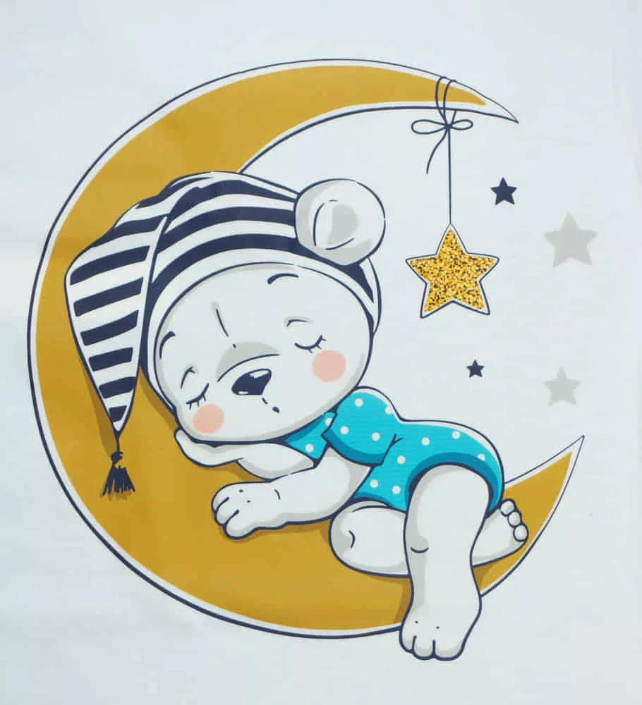 Puha, világoskék színű tipegő hálózsák, amit hold minták díszítenek - tökéletes választás kisbabád éjszakai pihenéséhez.