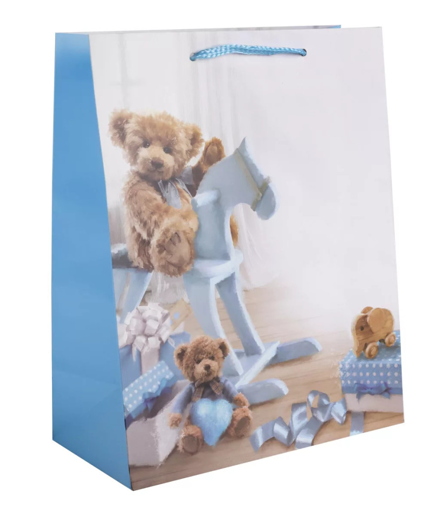 Ajándéktasak macik és kék hintaló 18x23 cm