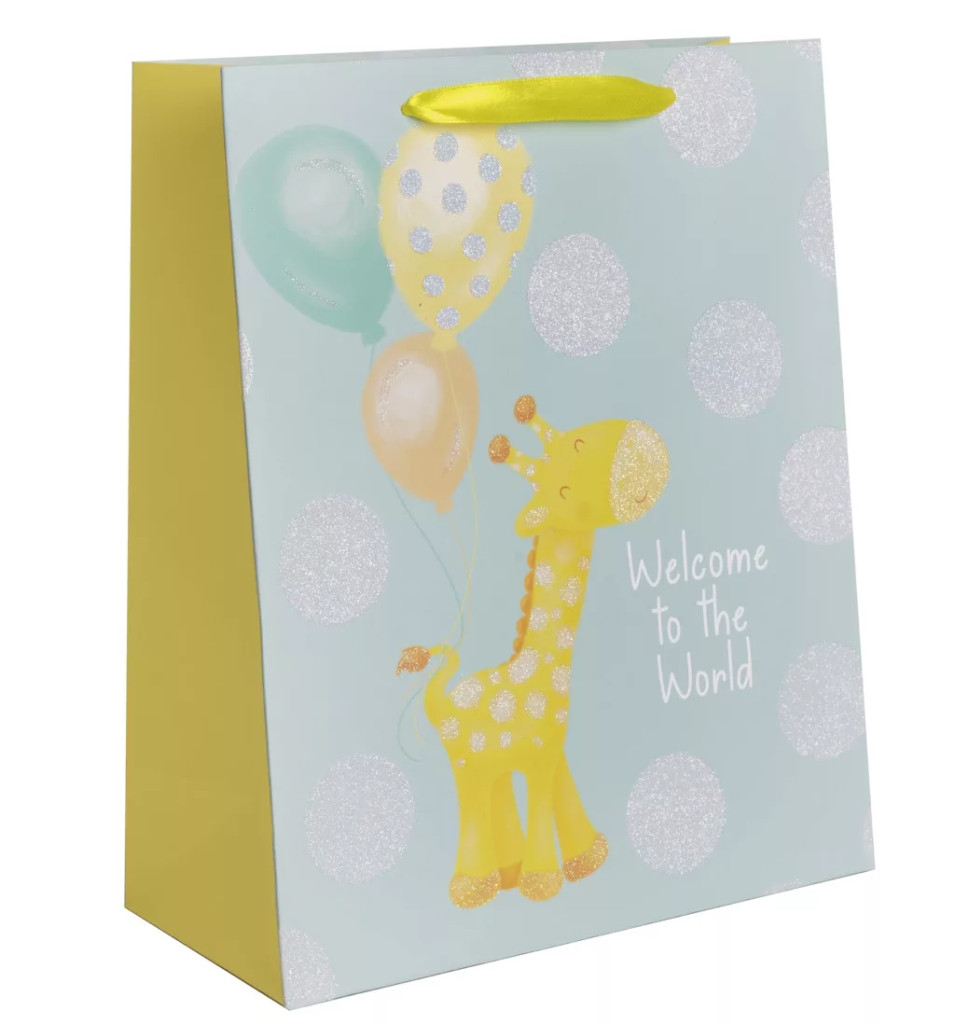 Ajándéktasak Zsiráf lufikkal, Welcome to the World felirat 18x23 cm