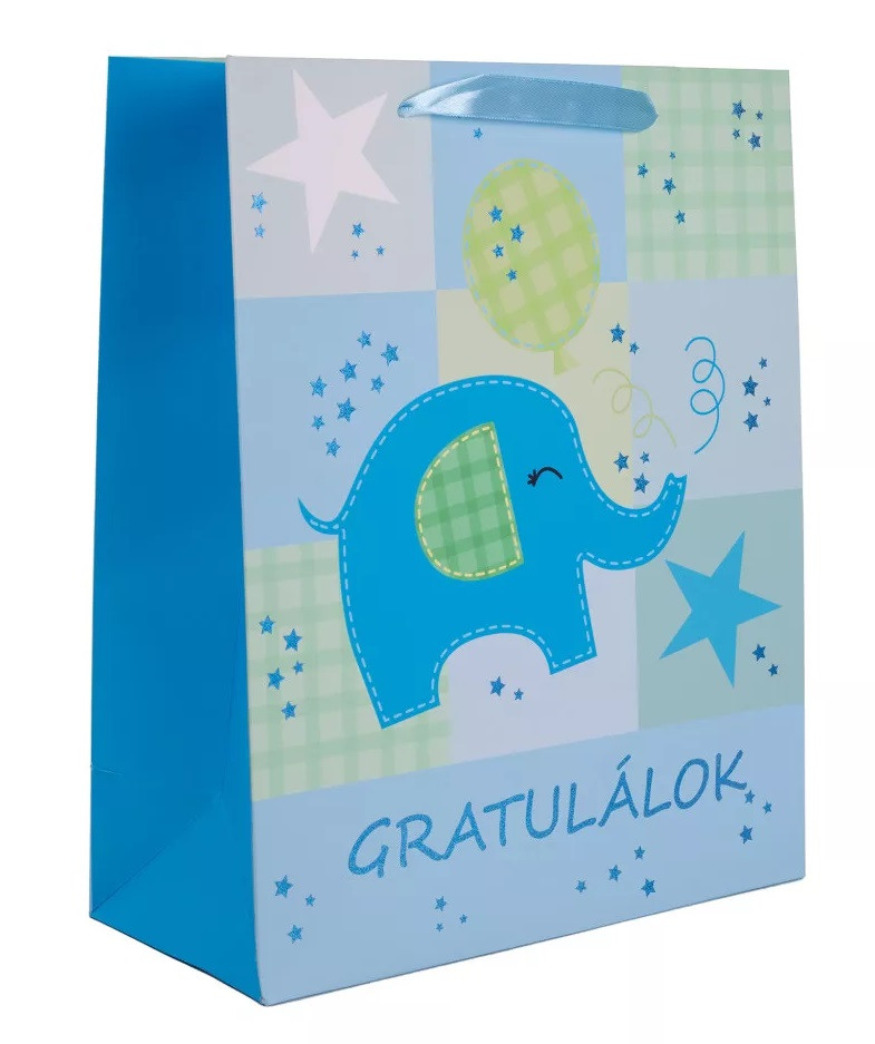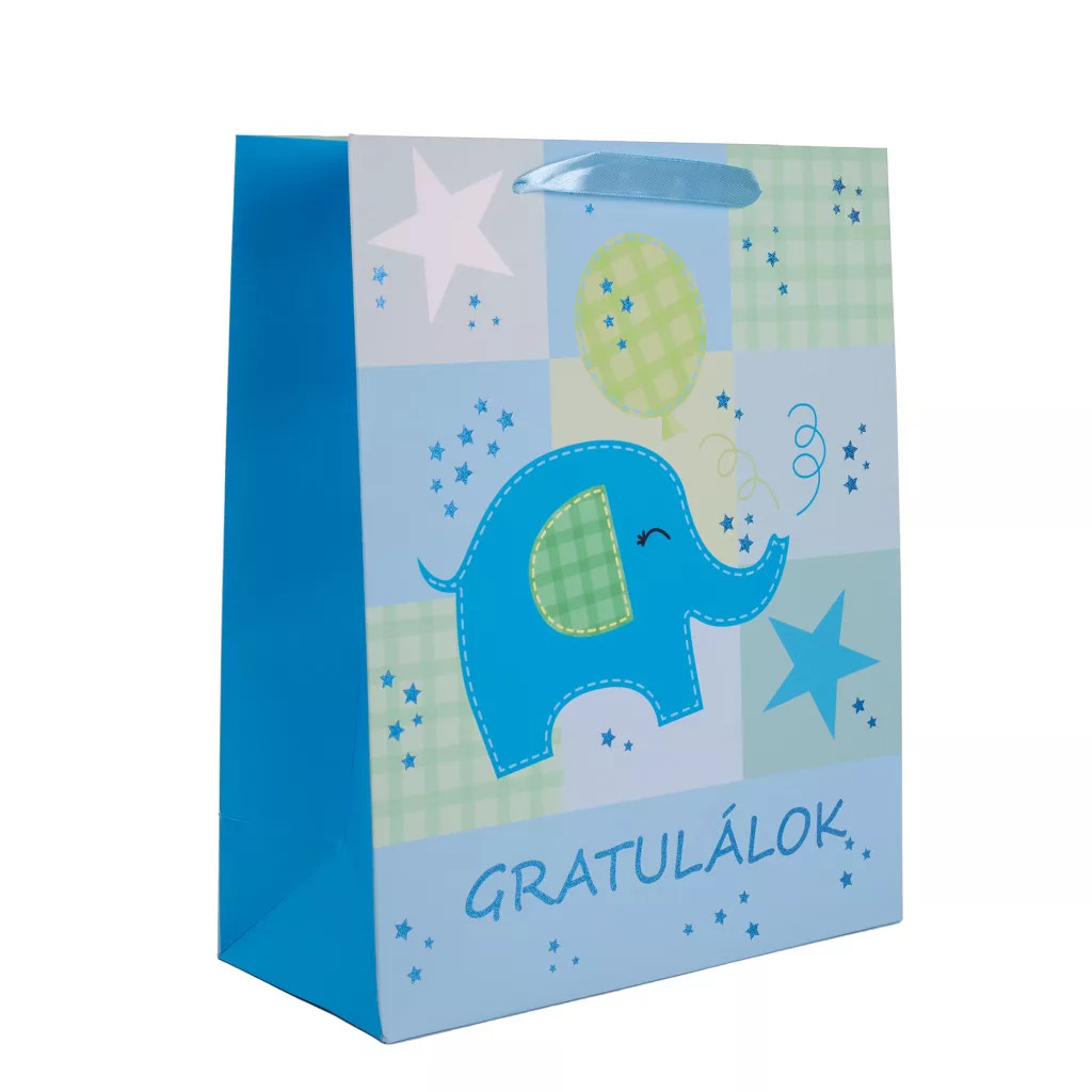 Ajándéktasak Gratulálk felirat, kék elefánt 26x32 cm