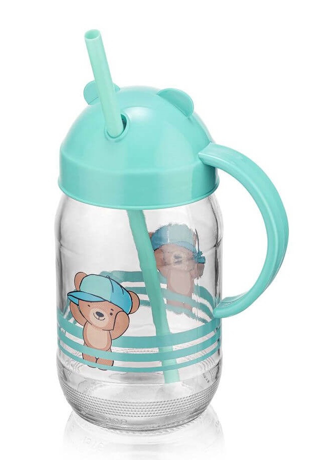 QLUX szívószálas üvegpohár 370ml - Teddy kék