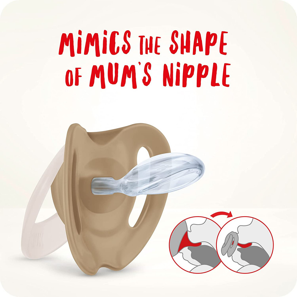 A továbbfejlesztett, eredeti NUK-forma alakja az anya mellbimbójának szoptatás közben felvett formáján alapszik. Megfelelően igazodik a baba szájüregéhez, amint a baba megkezdi a cumizást. A vékonyabb és keskenyebb cuminyak csökkenti az állkapcson és a fogakon lévő nyomást.