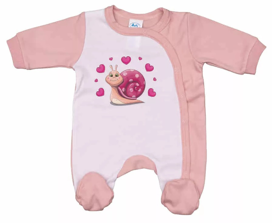 Praktikus és kényelmes viselet ez a nagyon vagány csiga mintával nyomott baba rugdalózó.