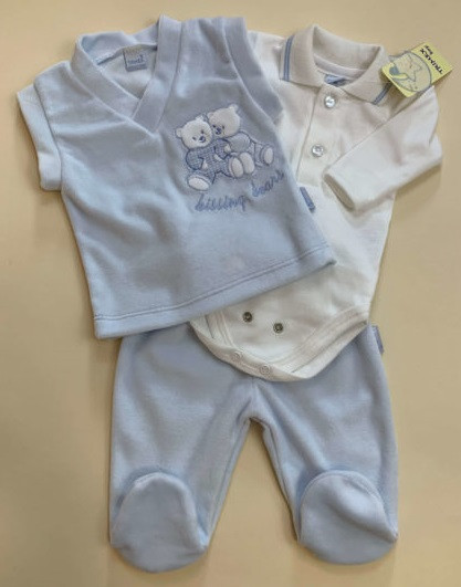 Kisfiúknak plüss belebújós mellény hímzéssel,kétméretes, galléros pamut hosszú ujjú kombidressz és plüss derekas, lábfejes nadrág.
