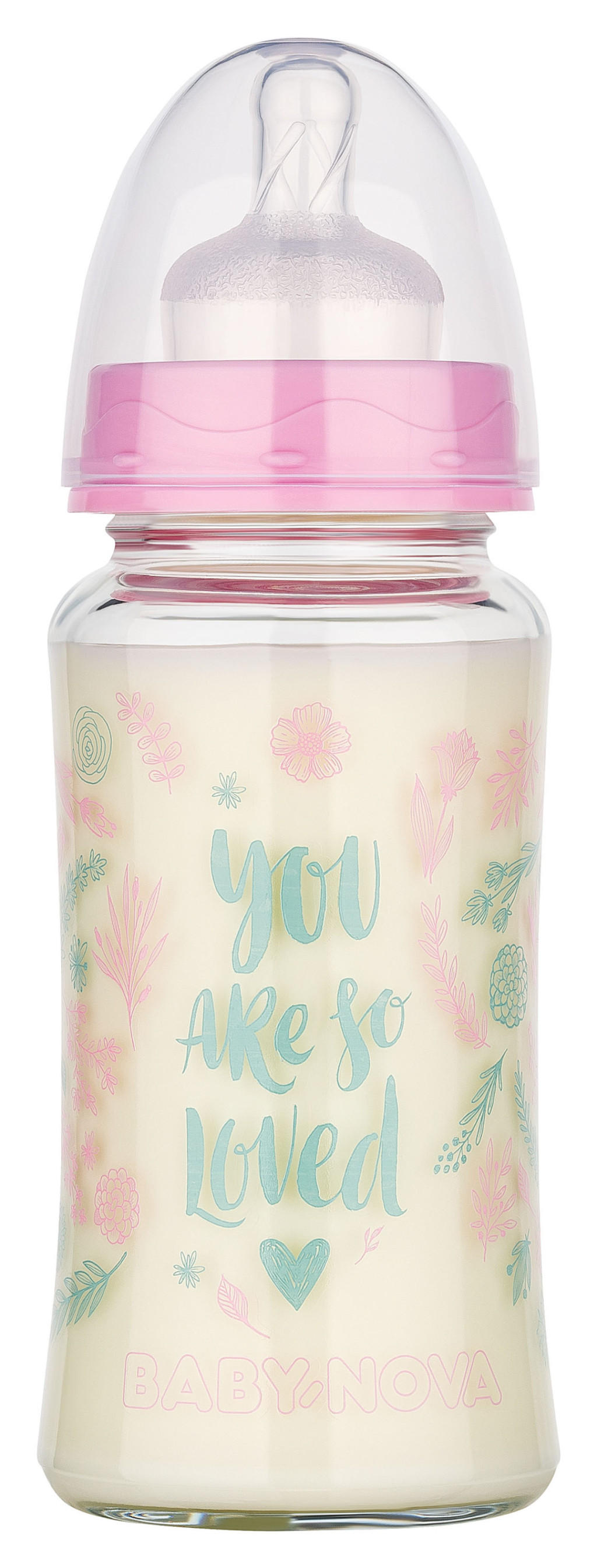 Baby-Nova üveg cumisüveg széles nyakú 230 ml 0-24hó szilikon cumival M-es - rózsaszín