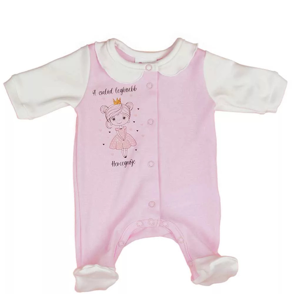 A család legkisebb Hercegnője mintával nyomott hosszú ujjú, elöl patentos vékony pamut baba rugdalózó.