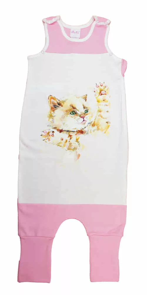 Cica mintával nyomott, vállon patentos, oldalt cipzáras, lábfej része ráhúzható ujjatlan pamut tipegő hálózsák.