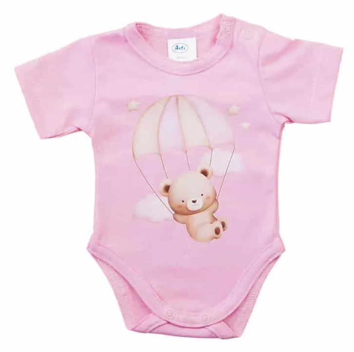 A vidám színű, rövid ujjú baba body bájos mintával varázsolja még édesebbé kisbabáját.