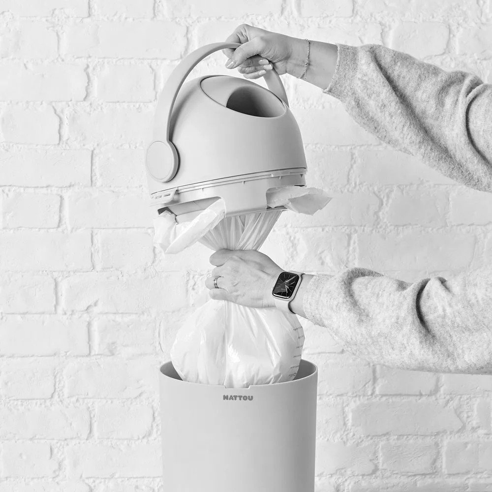 A fogantyú felemelésével a pelenkát kidobjuk a kukába, majd leengedjük a fogantyút, hogy a pelenka a zacskóba essen.