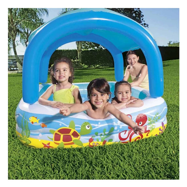Fedezze fel a végtelen vízi szórakozást a Bestway® Beach Buddy™ napvédőtetős pancsolómedencével, amely tökéletes választás a kis napimádók számára! Méretei, 140 x 140 x 114 cm, ideálisak a 2 éves és annál idősebb gyermekek számára, így garantálva a biztonságos és szórakoztató nyári fürdőzést. A pancsolómedence tengeri élővilág témájú dizájnja izgalmas és szórakoztató, míg az UV Careful™ napvédőtető védelmet nyújt a káros napsugarakkal szemben, így lehetővé téve a hosszabb, gondtalan kültéri játékot. A medence gyorsan és egyszerűen felfújható, kényelmes és biztonságos a kicsik számára. A 265 literes vízkapacitás tökéletes méret a játékos pancsoláshoz, és a medencéhez tartozó javítófolt biztosítja, hogy a szórakozás ne szakadjon meg váratlan kis balesetek esetén sem.