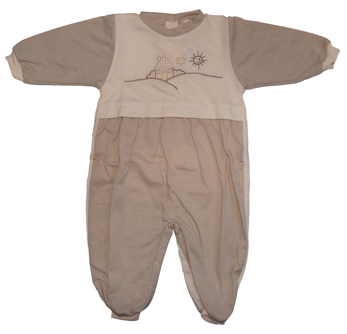 Praktikus és kényelmes viselet ez a nagyon vagány mintával baba rugdalózó.