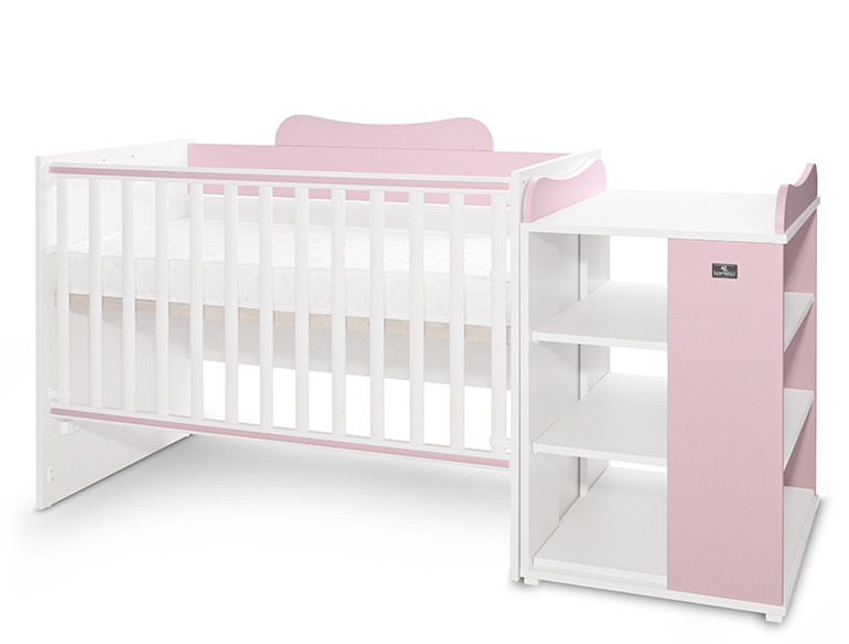 - Az újszülött kiságy 60×120 cm méretű, eltolható ráccsal, kényelmes nagy, három polcos komóddal