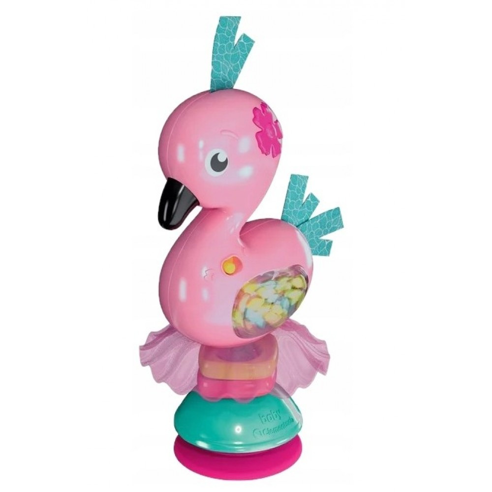 A flamingó puha tüllszoknyája, élénk színei és különböző textúrái segítik a tapintás, a látás és a hallás fejlődését. A szárnyak helyén található mintás anyagkiegészítők izgalmas felfedeznivalót kínálnak, a benne lévő apró golyók pedig csörgő hangjukkal minden mozdulatra reagálnak. A játék alján található tapadókorong segítségével könnyedén rögzíthető etetőszékre, asztalra vagy járókába, így a baba bármikor játszhat vele biztonságosan, anélkül hogy a játék elgurulna.