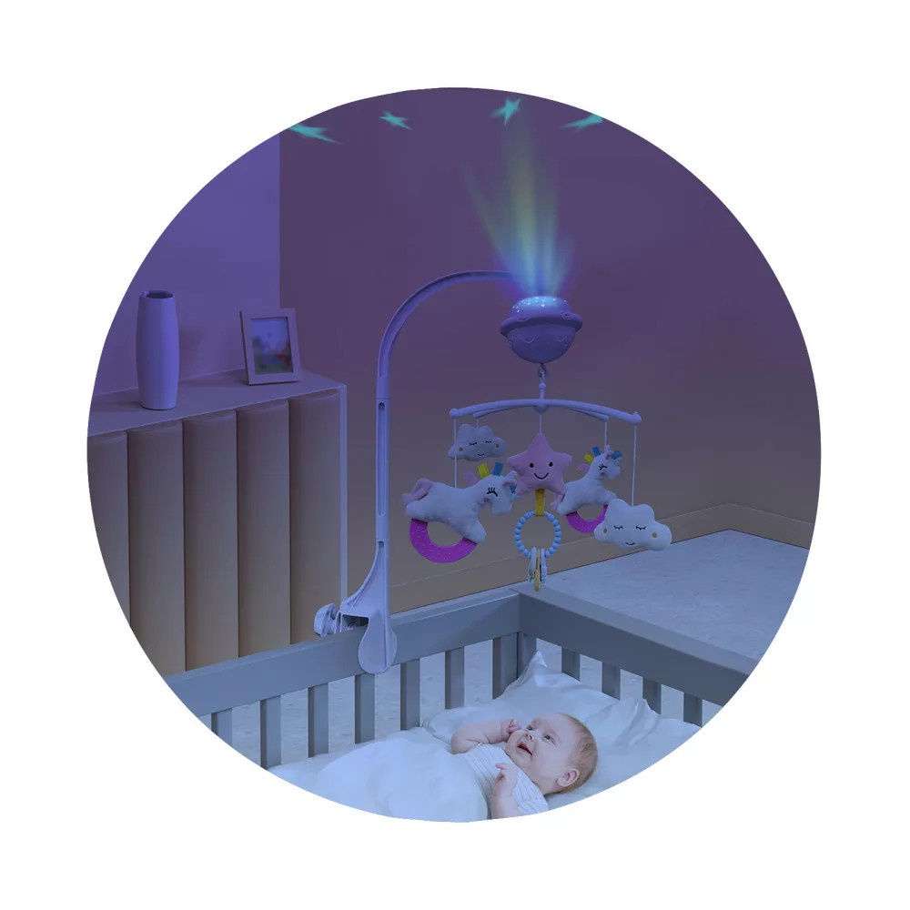 - Vetítő funkció: Színes formák és fények vetítése, amelyek megnyugtatják a babát és lekötik a figyelmét.