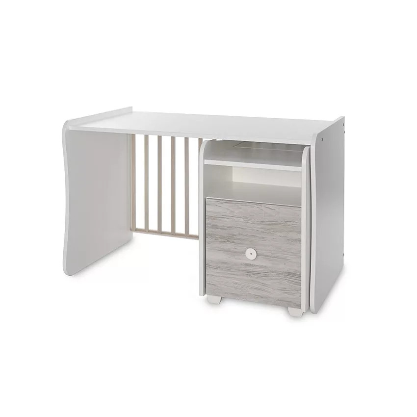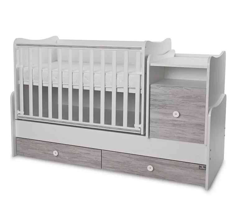 - Szuper megoldás, hogy a kiságy és a komód összetartozik, így nem kell két külön bútordarabot vásárolni. Amikor már nincs szükség rácsos kiságyra, a komód és a rácsok levételével egyszerűen át lehet alakítani ifjúsági heverővé és éjjeliszekrénnyé.