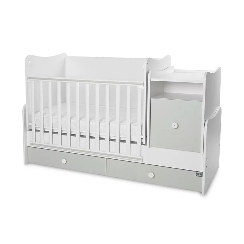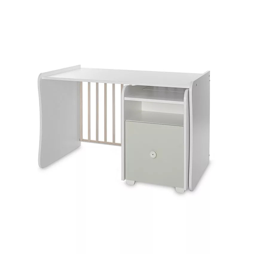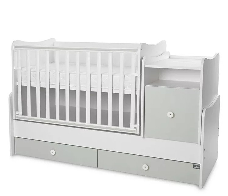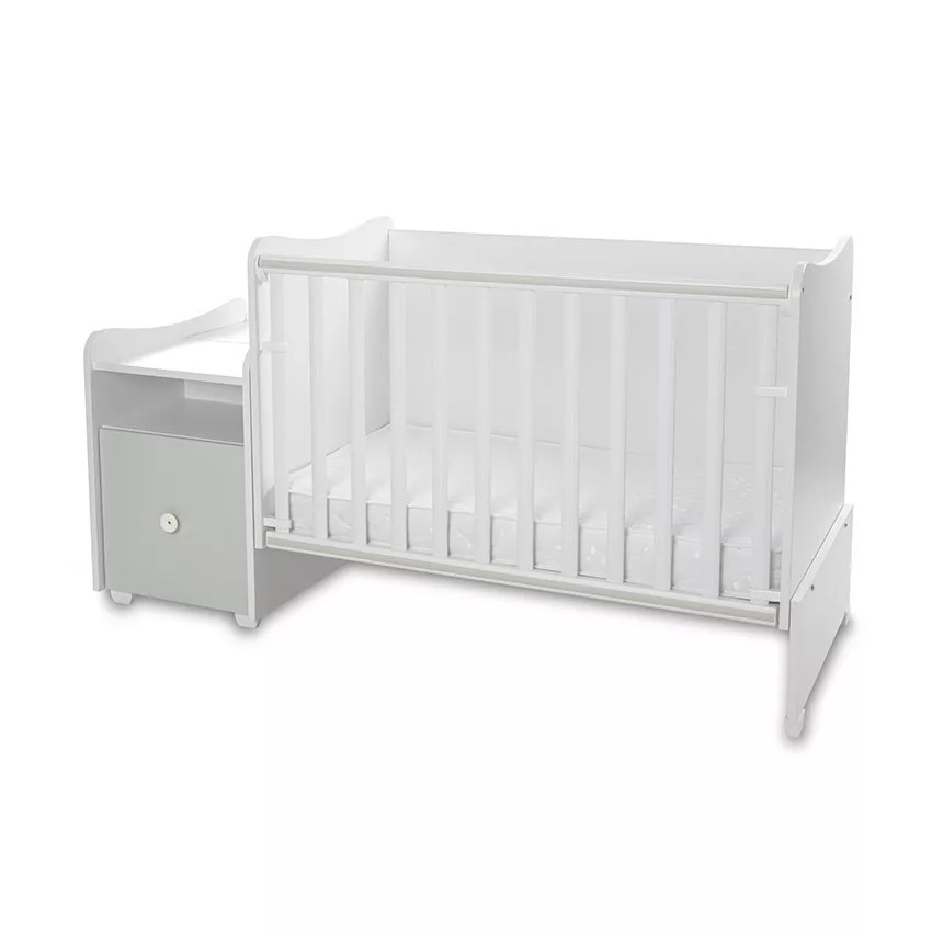 - Szuper megoldás, hogy a kiságy és a komód összetartozik, így nem kell két külön bútordarabot vásárolni. Amikor már nincs szükség rácsos kiságyra, a komód és a rácsok levételével egyszerűen át lehet alakítani ifjúsági heverővé és éjjeliszekrénnyé.