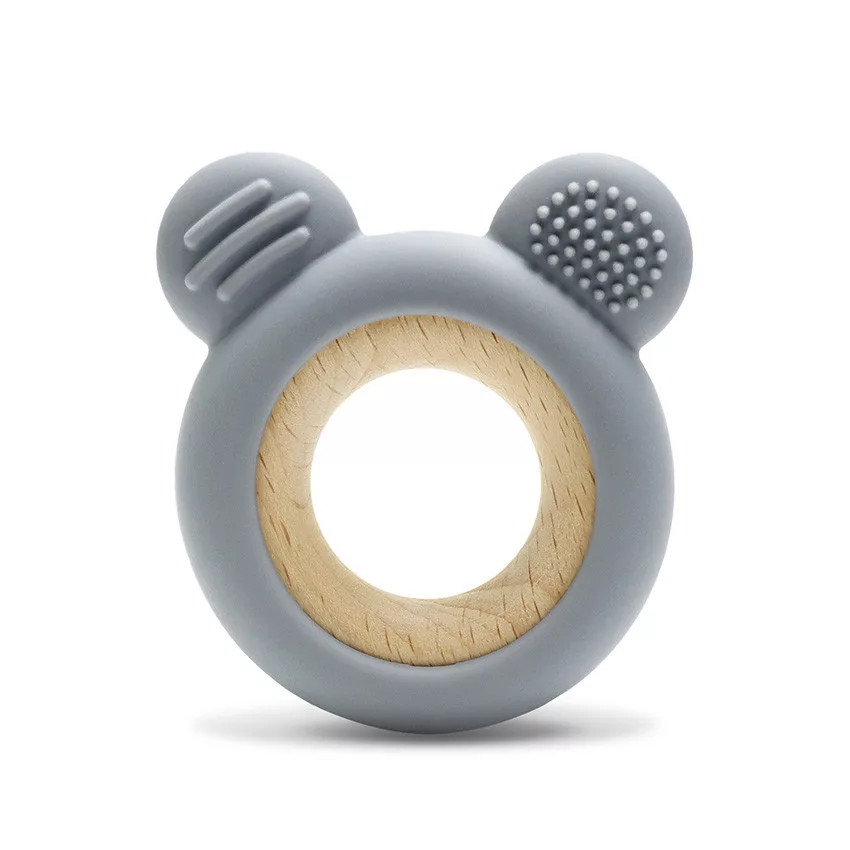 Macifej formájú rágóka, amely természetes szilikonból és bükkfából készült.