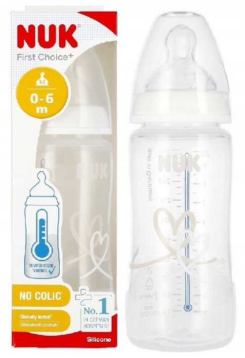 NUK First Choice hőmérséklet méréssel cumisüveg. Kólika elleni szeleppel ellátott. A cumi a mell rugalmassága és mozgása mintája alapján tervezett. Anti Colic Air rendszerrel rendelkezik. Szuperérzékeny hasfájásmegelőző szelepének köszönhetően a levegő áramlás szabályozott etetés közben, így kevesebb levegőt nyel a baba, ennek köszönhetően csökken a hasfájás. A cumisüvegek új NUK hőmérsékleti mutatóval rendelkeznek, hogy a baba ne egyen meg túlságosan meleg ételt. A kék hőmérséklet mutató fehérre vált ha az étel túl meleg. Ideális esetben az étel hőmérsékletének (37 ° C) kell lennie, amely megfelel a kijelző kék színének. Nagyon minőségi műanyagból készült. Űrtartalma 300 ml. 0-6 hónapos kori gyermekeknek ajánlott M (közepes lyukú = bébiétel). Nem tartalmaz BPA-t (Bisfenol A). Klinikailag tesztelt.
