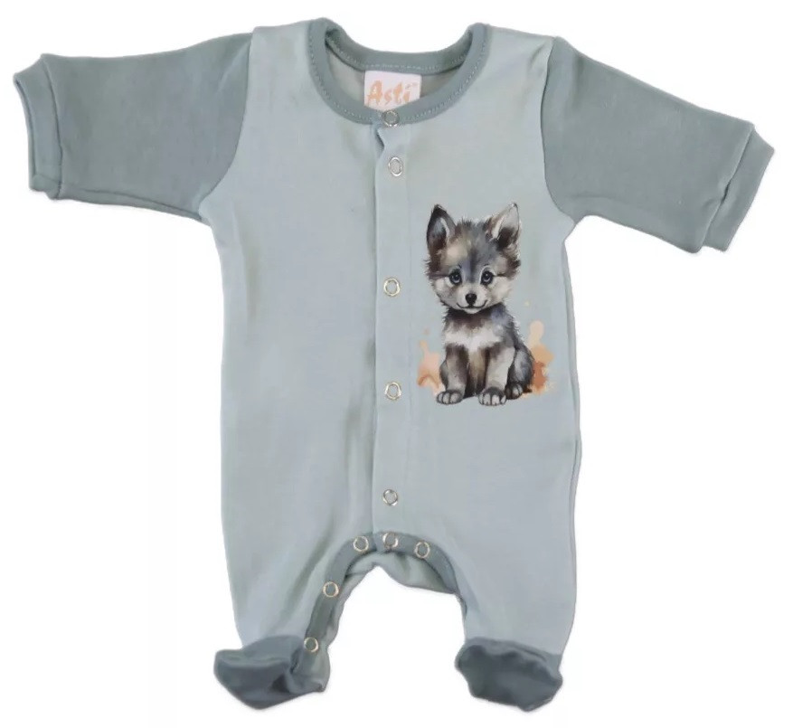 Praktikus és kényelmes viselet ez a nagyon vagány Farkas mintával nyomott baba rugdalózó. Elöl patentos megoldás, mely megkönnyíti a peluscserét és az öltöztetést. Az egyik legjobb megoldás különösen újszülötteknél és az első néhány hónapban. Minőségi, 100% pamut bababarát anyagból készült, ami jól mosható, könnyen kezelhető.