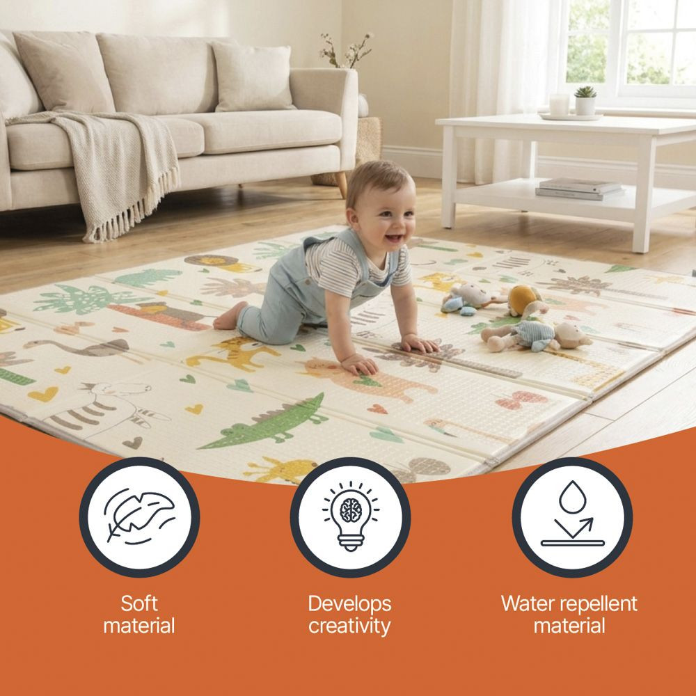 A puha, de kellően kemény hab megvédi a gyermeket a kemény padlótól és elnyeli az esések okozta ütéseket. A szőnyeg ideális teret teremt a mászáshoz, játékhoz és pihenéshez.